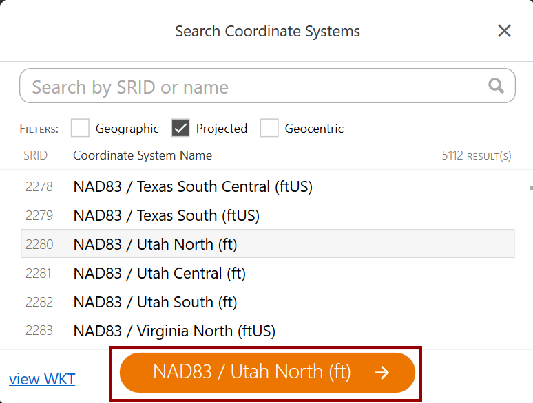 - Narrow the list by applying a filter or searching by Spatial Reference Identifier (SRID) or name.