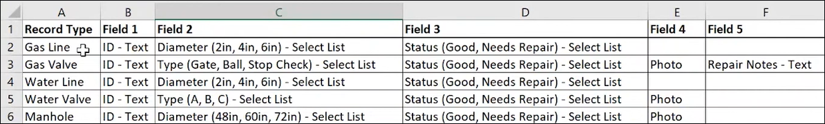 For example, for a gas utility company, the Uinta project might contain the mapped positions of gas lines and meters. The location of each gas line is collected as a line record type and includes fields for the gas line's diameter, date it was inspected, and its condition. A point record type collects the location of each gas meter and includes fields for the condition of the meter, date it was inspected, and photo.
