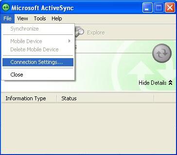 Open Microsoft ActiveSync on the desktop PC, click on the File menu, and then Connection Settings.