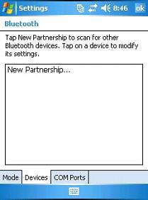 On the Field PC, tap on the Devices tab > New Partnership or Add New Device option, as shown below. Wait several seconds for the Field PC to complete searching for all nearby discoverable Bluetooth devices.