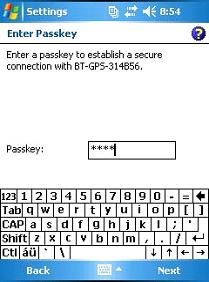 Enter the Bluetooth device`s security Passkey. If the device does not specify or require a Passkey, enter 0000 (or 0183 for some GPS receivers). If no passkey is accepted, leave the field blank, tap Next, and then when asked if you would like to add the device to the device list, tap the NO button.