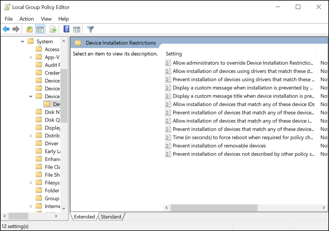 Select Computer Configuration > Administrative Templates > System > Device Installation > Device Installation Restrictions.