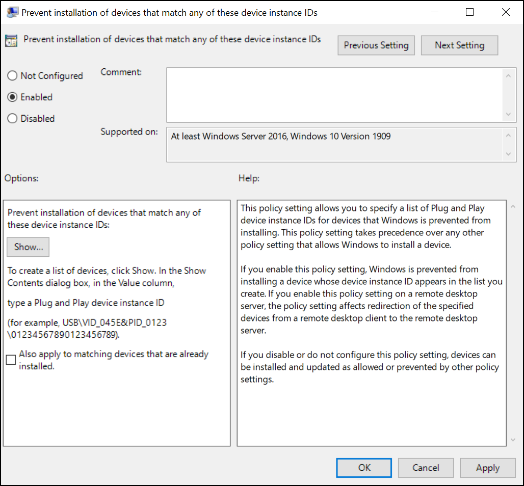 Tap Prevent installation of devices that match any of these Device IDs.